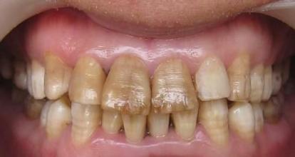 人体营养不良,有传染病等症状,牙齿在发育过程中,牙釉质发育不全,钙化受到影响,牙齿就会呈现出黄褐色。